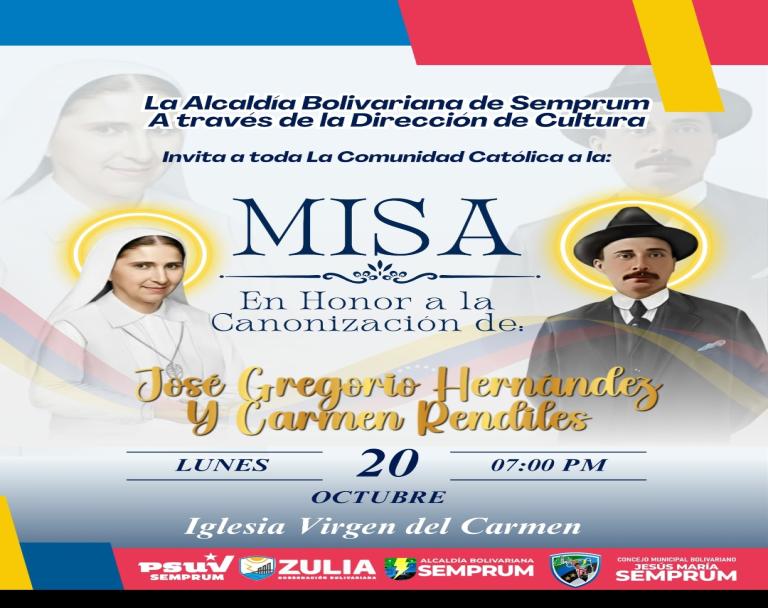 Mediante la Dirección de Cultura se Invita a toda la comunidad Católica a la Misa en Honor a la Canonización del Dr. José Gregorio Hernández y Carmen Rendiles.