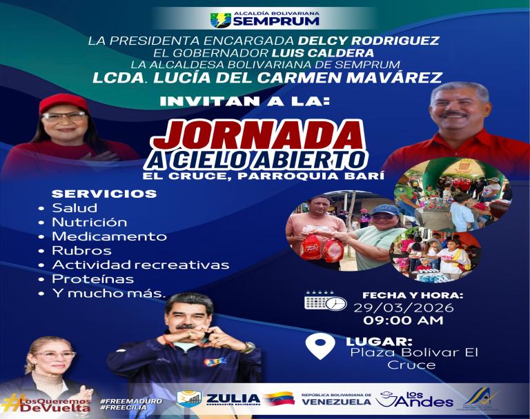 La Presidenta (E) Delcy Rodríguez, el Gobernador Luis Caldera, La Alcaldesa Bolivariana del Municipio Jesús María Semprum Licda. Lucia del Carmen Mavárez, Invitan a la Gran Jornada a Cielo Abierto el Cruce Parroquia Barí. donde contaremos con: Venta de Alimentos, Venta de Proteínas, Atención de Salud, Nutrición, Vacunación, Actividades Recreativas, Deportivas y Pinta Cáritas.