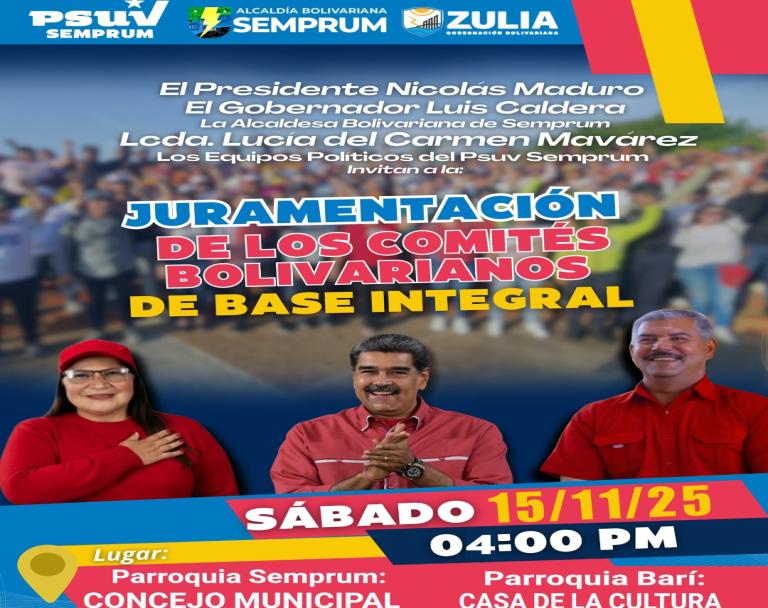 El Presidente Nicolás Maduro, El Gobernador Luis Caldera, La Alcaldesa Bolivariana de Semprum Lcda. Lucia del Carmen Mavárez, Los Equipos Políticos del Psuv Semprum. Invitan a la JURAMENTACIÓN DE LOS COMITÉS BOLIVARIANOS DE BASE INTEGRAL.