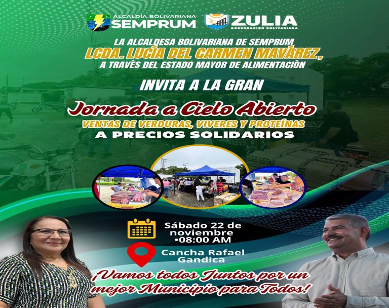 La Alcaldesa Bolivariana de Semprum Lcda. Lucia del Carmen Mavárez. A través del Estado Mayor de Alimentación. Invitan a todo el pueblo de Semprum a la Gran Jornada a Cielo Abierto. Venta de Verduras, Víveres y Proteínas a Precios Solidarios.