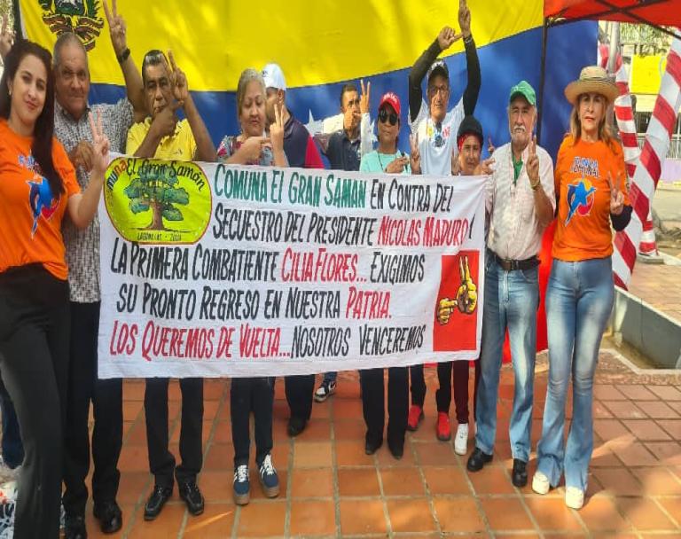 Voceros y voceras de las Comunas y Circuitos comunales del municipio Lagunillas #Zulia dicen presente en la plaza Bolívar para defender la soberanía, repudiar la agresión imperial y reafirmar su lealtad al legado del Comandante Chávez y su respaldo al presidente @NicolasMaduro Liberen a a Maduro!