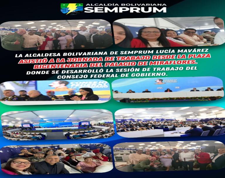 La Alcaldesa Bolivariana de Semprum Lucía Mavárez, asistió a la Jornada de trabajo desde la Plaza Bicentenaria del Palacio de Miraflores, en Caracas, donde se desarrolló la Sesión de Trabajo del Consejo Federal de Gobierno, este espacio se consolida como un punto de encuentro para el consenso, la paz y la armonía, orientado a la búsqueda del desarrollo económico y social del país.