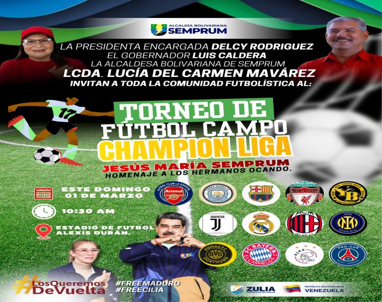 La Presidenta (E) Delcy Rodríguez, el Gobernador Luis Caldera, La Alcaldesa Bolivariana del Municipio Jesús María Semprum Licda. Lucia del Carmen Mavárez, Invitan a toda la comunidad Futbolística al Torneo de Futbol Campo Champion Liga Jesús María Semprum, en Homenaje a los Hermanos Ocando.