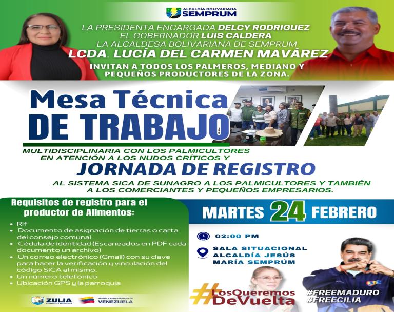 La Presidenta (E) Delcy Rodríguez, el Gobernador Luis Caldera, La Alcaldesa Bolivariana del Municipio Jesús María Semprum Licda. Lucia del Carmen Mavárez, Invitan a todos los Palmeros, medianos y pequeños productores de la zona a una Mesa Técnica de Trabajo.