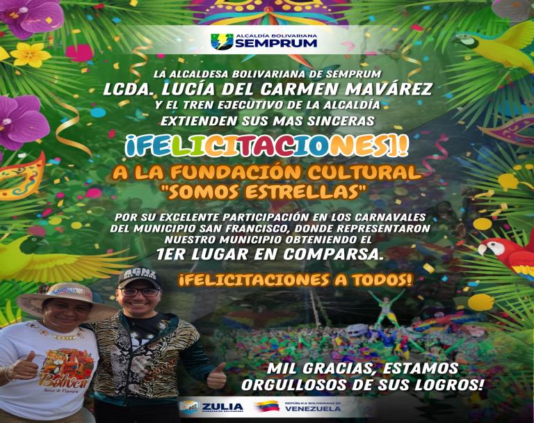 La Alcaldesa Bolivariana del Municipio Jesús María Semprum Licda. Lucía del Carmen Mavárez, y el tren ejecutivo de la Alcaldía, extienden sus más sinceras Felicitaciones a la Fundación Cultural Somos Estrellas. Por su excelente participación en los Carnavales del Municipio San Francisco, donde representaron nuestro municipio obteniendo el 1er. Lugar en Comparsa.
