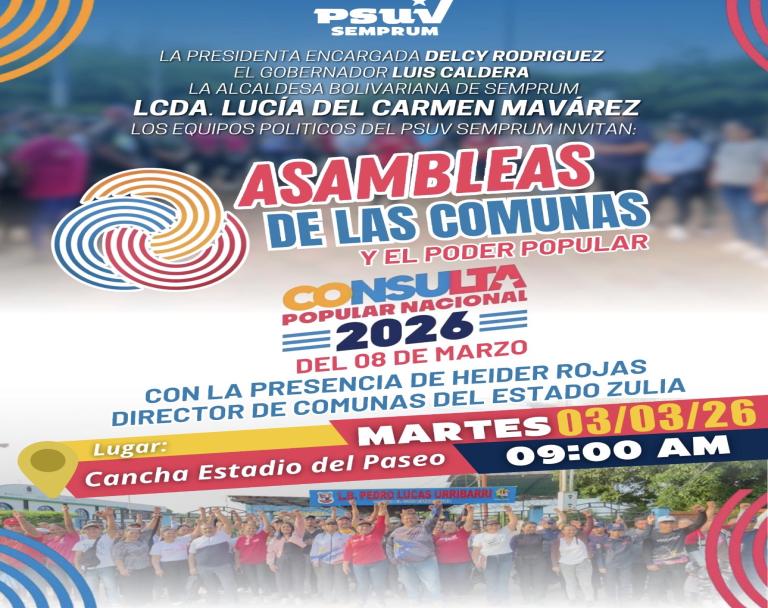 La Presidenta (E) Delcy Rodríguez, el Gobernador Luis Caldera, La Alcaldesa Bolivariana del Municipio Jesús María Semprum Licda. Lucia del Carmen Mavárez, los equipos políticos PSUV Semprum, Invitan a las Asambleas de las Comunas y el Poder Popular de cara a la Primera Gran Consulta Popular Nacional 2026 del 08 de marzo. La misma contará con la presencia de Heider Rojas, Director de Comunas del Estado Zulia.