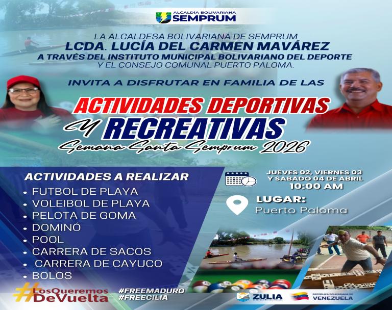 La Alcaldesa Bolivariana del Municipio Jesús María Semprum Licda. Lucía del Carmen Mavárez, a través del Instituto Municipal Bolivariano del Deporte y el Consejo Comunal de Puerto Paloma. Invitan a todo el pueblo de Semprum, a disfrutar en familia de las Actividades Deportivas y Recreativas Semana Santa Semprum 2026.
