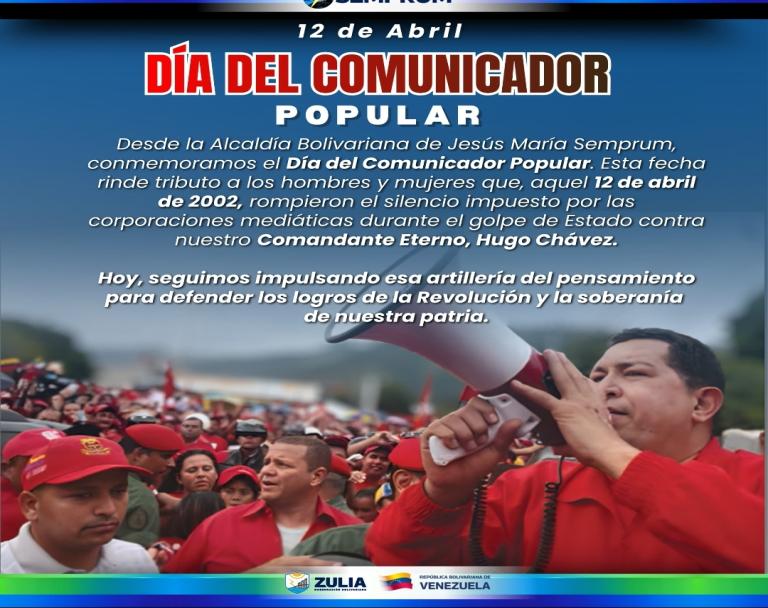 Desde la Alcaldía Bolivariana de Jesús María Semprum, conmemoramos el Día del Comunicador Popular. Esta fecha rinde tributo a los hombres y mujeres que, aquel 12 de abril de 2002, rompieron el silencio impuesto por las corporaciones mediáticas durante el golpe de Estado contra nuestro Comandante Eterno, Hugo Chávez.