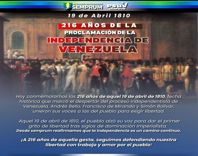 Hoy conmemoramos los 216 años de aquel 19 de abril de 1810, fecha histórica que marcó el despertar del proceso independentista de Venezuela, Andrés Bello, Francisco de Miranda y Simón Bolívar, unieron sus voces a las del pueblo para exigir libertad.