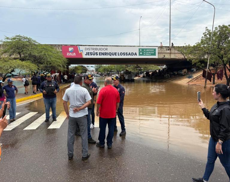 (Maracaibo, 25 de abril de 2026.- Una respuesta inmediata dio la Alcaldía Bolivariana de Maracaibo ante las cuatro horas de lluvia, aproximadamente, que sorprendieron a los marabinos este sábado 25 de abril. Los funcionarios del Instituto Municipal del Ambiente (IMA) —dependencia del ayuntamiento—, Seguridad Ciudadana, Bomberos y Protección Civil iniciaron la atención en los sectores afectados. Procedieron a verificar el cauce de las cañadas principales y sus ramales siguiendo las instrucciones del alcalde Giancarlo Di Martino, quien estuvo al frente de las inspecciones en los puntos más complicados, entre ellos el distribuidor Jesús Enrique Lossada, en el casco central de la ciudad.